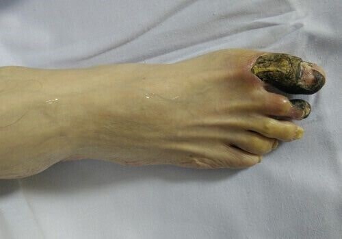 الغرغرينا في القدم. صورة من الأرشيف. لا يمكن إنقاذ المرأة.